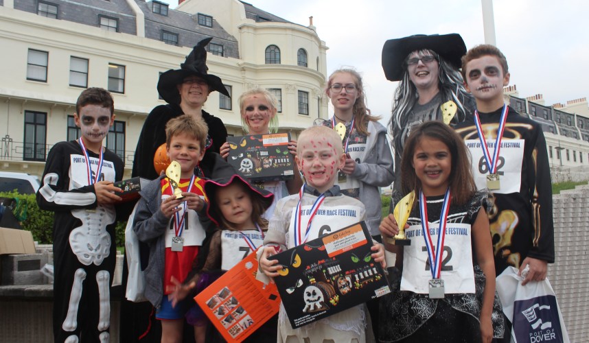 Mini Monster Mayhem in Port’s Halloween Spooktacular 0 comments / Category : Press Release On Friday afternoon, Dover’s normally tranquil seafront was taken over by hordes of magnificent monsters as the Port of Dover’s Mini Monster Race got underway. Skeletons, ghosts and vampires were among the many contestants competing for the fastest time and the scariest costume. Monsters and Mums and Dads charged along Marine Parade like a horrible hurricane, scaring everyone in their path. The contest was split into two heats. The three to seven-year-old’s race was won by James and Sadie and the race for eight to fourteen-year-olds was won by Rebekah and Yad. The scariest costume winners were Lennie and Livvie-Mae for the three to seven-year-olds and Sophie and Daniel for the older competitors. All runners received medals and goody bags and the winners also received a trophy and spookily decorated cakes, all presented by Port of Dover Chief Executive, Tim Waggott. Port of Dover Director of Corporate Development, Barbara Buczek said; “This year’s community Halloween race was another great success and it was fantastic to see the effort that everyone made. It’s wonderful to see families having fun together and I’d like to congratulate the competitors for helping us all get into the spirit.” Following the run and presentations, everyone tucked into free hotdogs and drinks generously supplied by Riverside Catering and all proceeds from the event have been donated to local charities. For details of future Port of Dover events visit our events page: www.doverport.co.uk/events