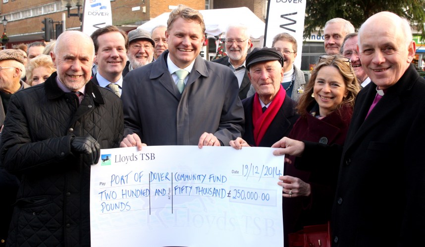 Port of Dover goes to town 0 comments / Category : Press Release A cheque for £250,000 was presented by George Jenkins OBE, Chairman of Dover Harbour Board and Tim Waggott, Chief Executive of the Port of Dover, to the Right Reverend Trevor Willmott, Bishop of Dover, who is leading the independent community fund panel and The Lady Colgrain, the Chairman of Trustees of the Kent Community Foundation, which is providing administrative support. The official handover took place in Dover town centre’s Market Square by the Christmas tree that the Port had erected for the town’s recent Christmas Lights Switch On event. Tim Waggott said: “I am absolutely delighted to present the cheque for £250,000 as a real and visible sign of our commitment to our community. This kick starts the Port of Dover Community Fund which will see an ongoing tangible and significant contribution to supporting learning, education and skills as well as enriching the social, cultural and environmental life of local communities. Today sees the result of much hard work with the local community in establishing the priorities for the fund and enables us to achieve even more together in the years ahead.” On receiving the cheque, the Right Reverend Trevor Willmott said: “It is not just money. It is a pledge to help bring hope to young people and to the community of Dover. A great day!” The ceremony was attended by a number of local dignitaries and community representatives including Charlie Elphicke MP, Deputy Town Mayor Councillor Sue Jones and Chairman of the Dover Society and Port and Community Forum Derek Leach. To celebrate the happy occasion, the Port handed out festive drinks and mince pies to members of the public whilst Christmas carols filled the air. The first round of funding is planned to open from the middle of January 2015 and close on 31st March 2015 with the first awards being finalised in early June. ENDS Issued by Corporate Affairs on 01304 240400 (ext. 4410 from 8.30 – 17.00) Notes to Editors The purpose of the Port of Dover Community Fund will be to benefit the Dover community, focussing on charitable activities within the following two main areas: Skills & Jobs: To enable the Port to support projects that will provide opportunities through learning, education and skills. To assist job creation and to help improve people who are changing employment. Most notably to be supportive of efforts that focus on young people. Community: To support activities that will provide opportunities to enrich the social, cultural and environmental life of local communities. To assist in creating an attractive and welcoming destination for both visitors coming to the region through the UK’s premier port and for potential inward investors promoting economic growth in Dover. Subject to the purposes as described above, detailed guidelines and grant-making priorities will be developed. Administrative support for the fund will be provided by the Kent Community Foundation who will agree detailed guidelines, grant-making priorities and the schedule of funding rounds in consultation with the Port of Dover Community Fund Panel led by the Right Reverend Trevor Willmott Bishop of Dover. The Foundation will promote the Fund and open it to applications from the local community under their normal grant-making application processes. More details on the make-up of the panel, and the process for applications will be announced early in the New Year.